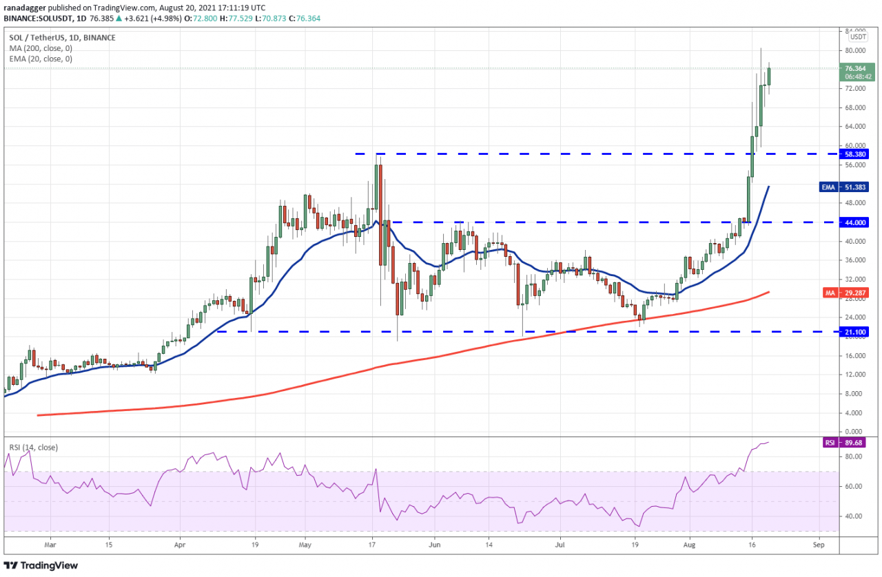 SOL/USDT 货币对在 8 月 16 日突破了历史高点 58.38 美元,并继续走高。 过去几天的强劲反弹已将 RSI 推高至 89 以上,表明短期内上涨过度。