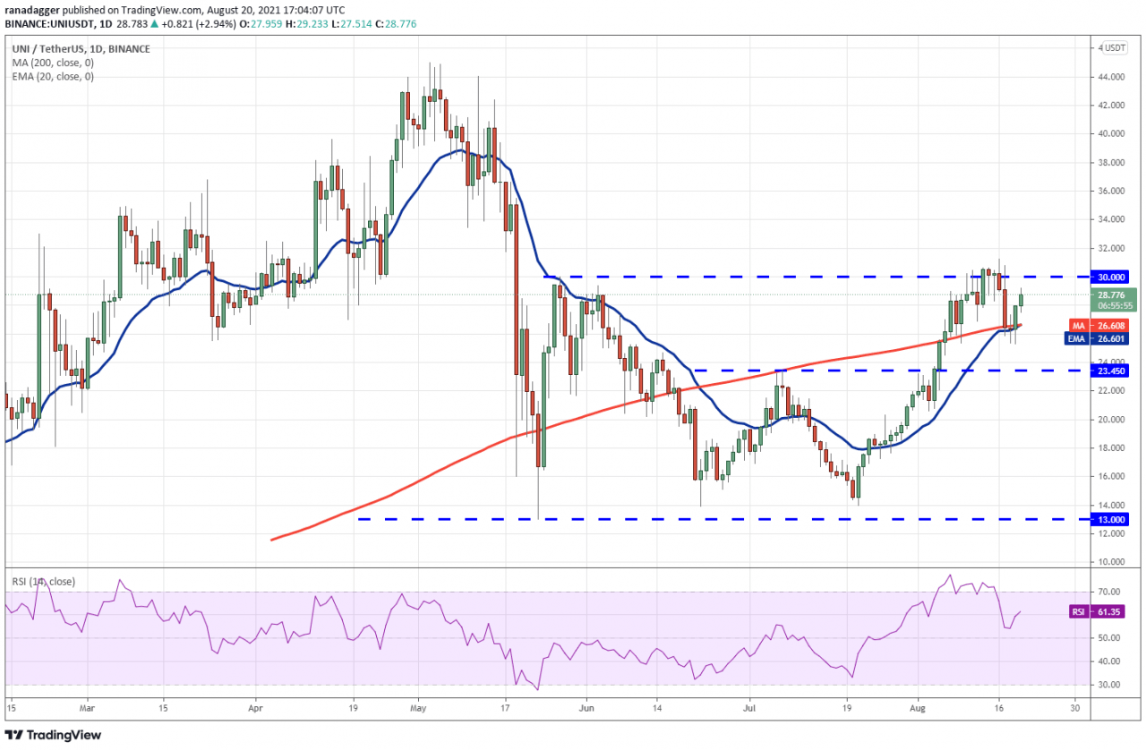 多头未能将 Uniswap (UNI) 维持在 30 美元上方的上方阻力位吸引了获利了结,这导致价格在 8 月 16 日走低。尽管空头在 8 月 18 日和 8 月 19 日将价格拉低至移动平均线下方,但他们无法维持较低的水平。