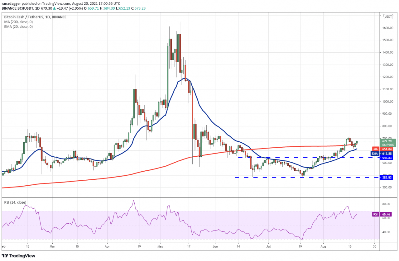 这表明市场情绪转为积极,交易商逢低买入。 多头在 8 月 19 日将价格推回到 200 日均线上方,现在将尝试将 BCH/USDT 对推高至 714.66 美元上方。