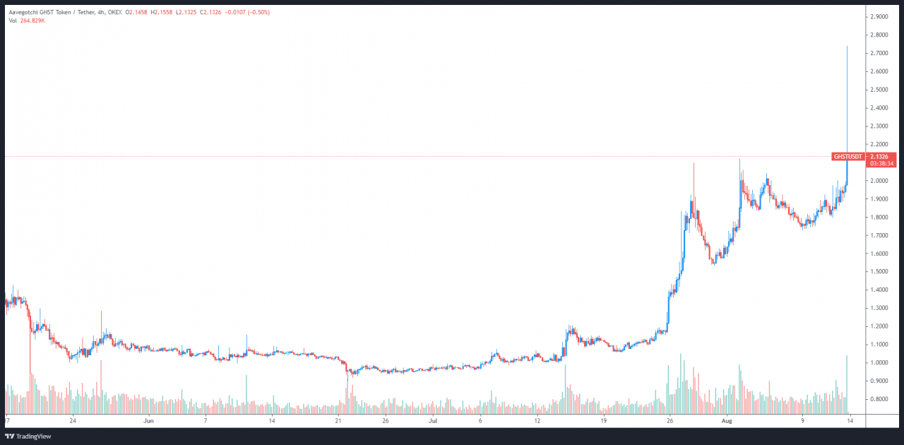 Cointelegraph Markets Pro 和 TradingView 的数据显示,自 6 月 22 日触及 0.896 美元的低点以来,GHST 的价格已上涨 202%,在 8 月 13 日创下 2.74 美元的历史新高。