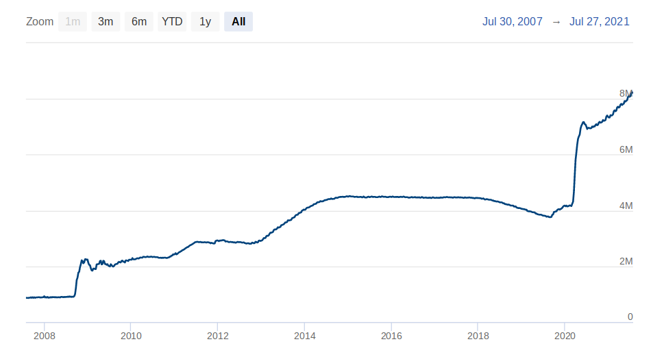 他的话是在美联储资产负债表创下新纪录的一周后发表的,该资产负债表在 7 月 26 日首次突破 8.24 万亿美元。