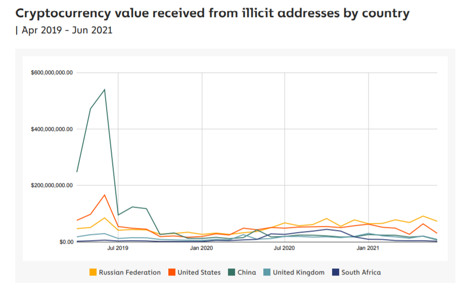 Chainalysis 在 8 月 3 日的《加密货币与中国》报告中表示,在 2019 年 4 月至 2021 年 6 月期间,价值超过 22 亿美元的加密货币已从中国钱包发送到与非法活动相关的地址。