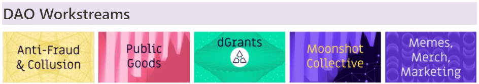 目前有五个独立的 DAO 工作流可供 Gitcoin 社区使用,包括反欺诈和勾结、公共物品、dGrants、moonshot 集体和“表情包、商品、营销”。