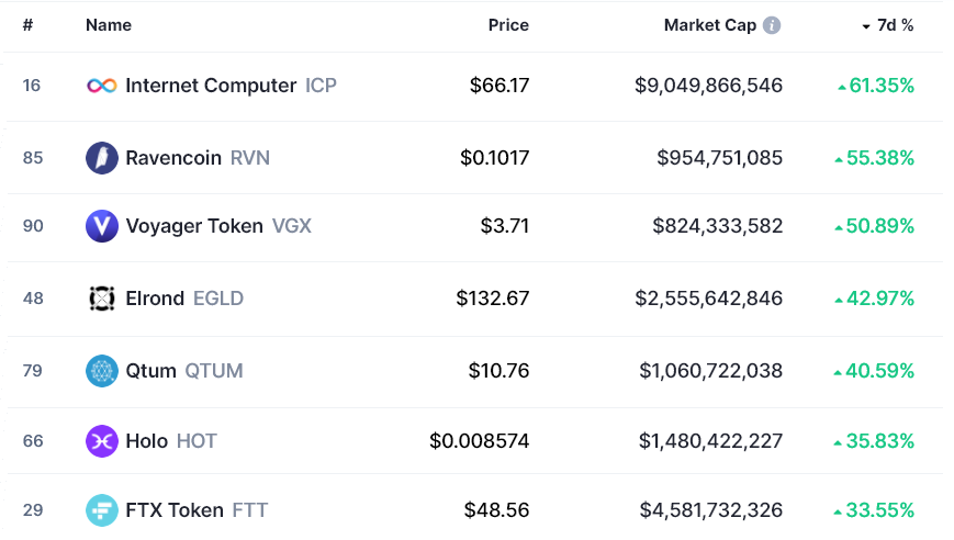 在 100 家最大的公司中,每周表现最好的公司。 资料来源:CoinMarketCap
