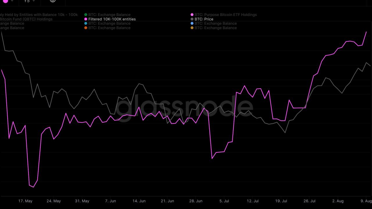 10,000-100,000 BTC 实体增长K线走势图。 资料来源:威廉克莱门特/推特