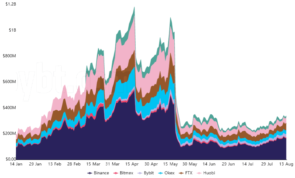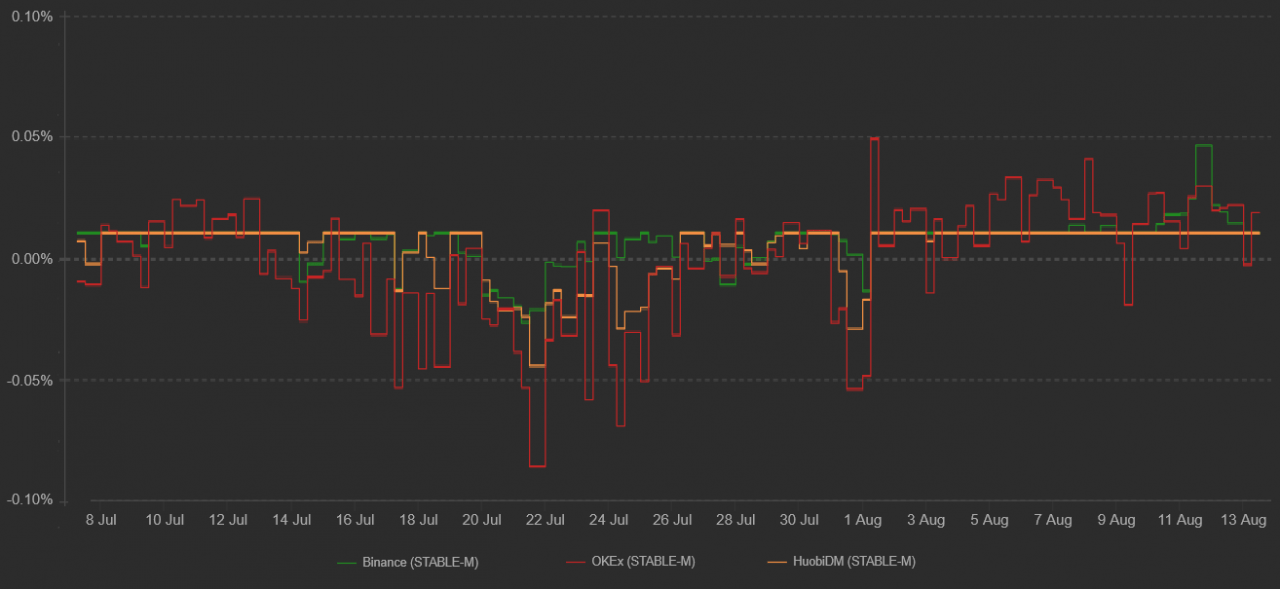 如上图所示,7月中旬至8月1日,资金利率大多为负,表明空头是需要更多杠杆的。 每 8 小时 0.05% 的负利率相当于每周 1%。 然而,在该指标在 0% 至 0.04% 之间波动后,过去两周情况发生了逆转,这一水平通常被认为是中性的。