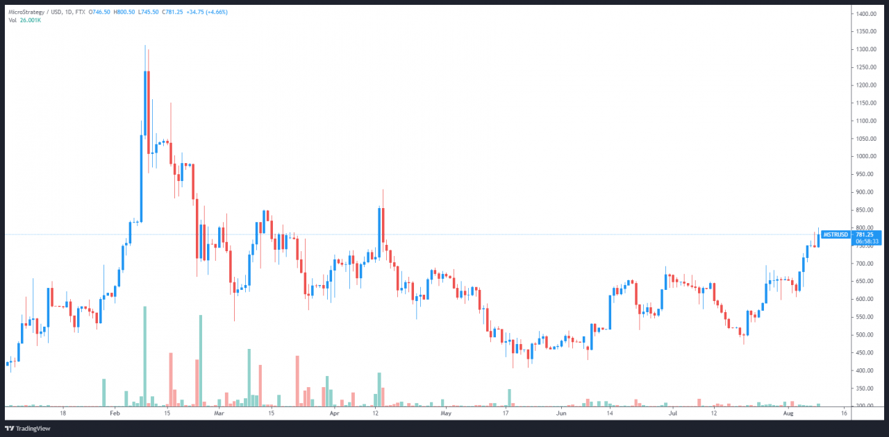 如上图所示,MSTR 的价格在 7 月 20 日触及 474 美元的低点,与比特币的低点同一天,此后上涨了 65%,交易价格为 781 美元。