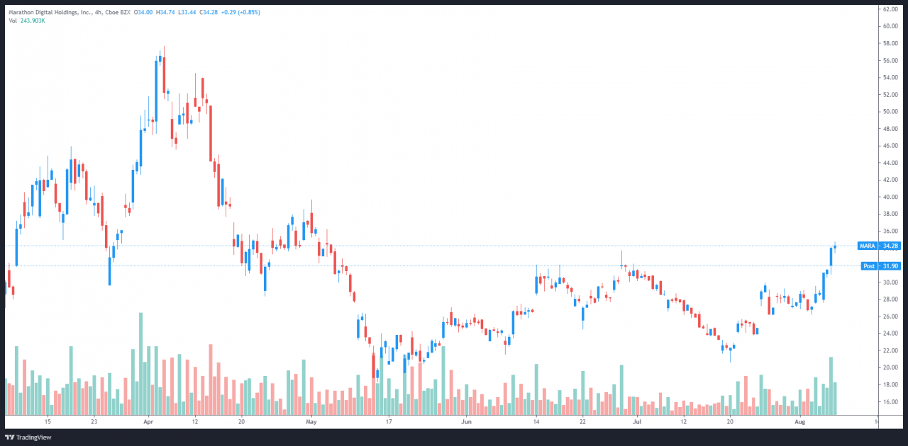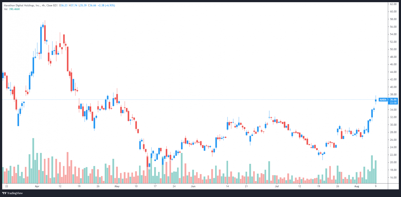 TradingView的数据显示,在7月20日触及20.52美元的低点后,MARA的价格在8月6日上涨了83%至37.77美元的盘中高点,成为过去两周表现最好的比特币矿业股。