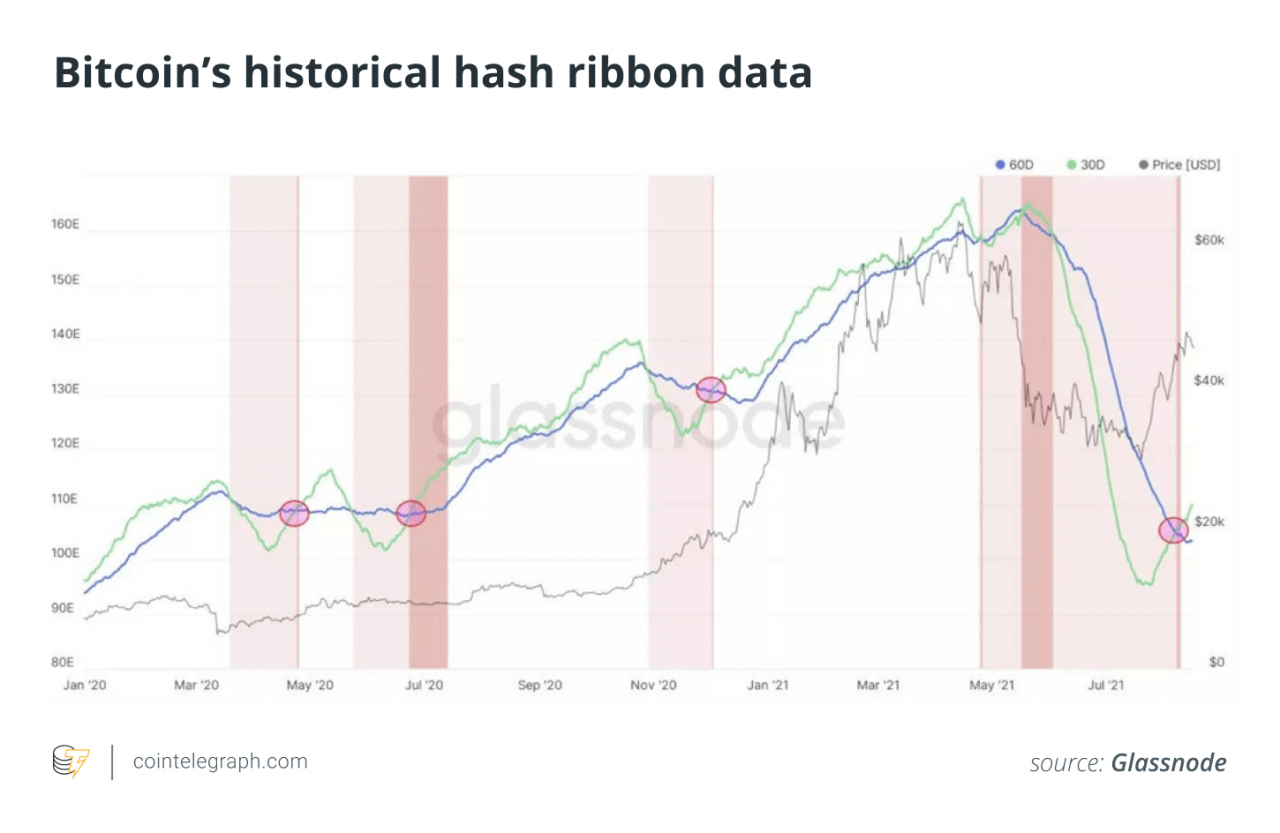 当资产的短期平均值高于其长期平均值时,就会观察到黄金交叉。 从上图可以看出,BTC 30 天和 60 天哈希带之间的比较表明交易量再次上涨。 同样重要的是要强调,在比特币于 2019 年 1 月和 2020 年以及 2020 年 3 月和 2020 年 12 月反弹之前发现了相同的形态。