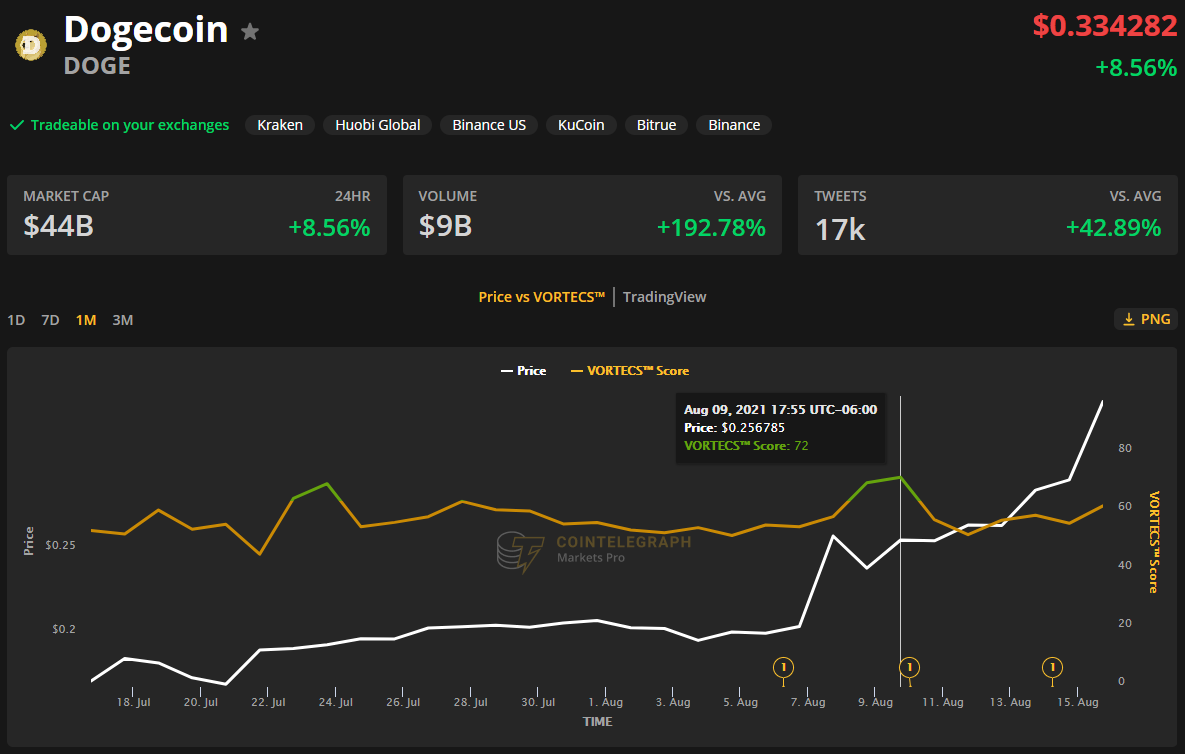 Cointelegraph Markets Pro 的 VORTECS™ 数据也记录了狗狗币动量的积极转变,该数据在最近价格上涨之前于 8 月 9 日开始检测到看涨前景。