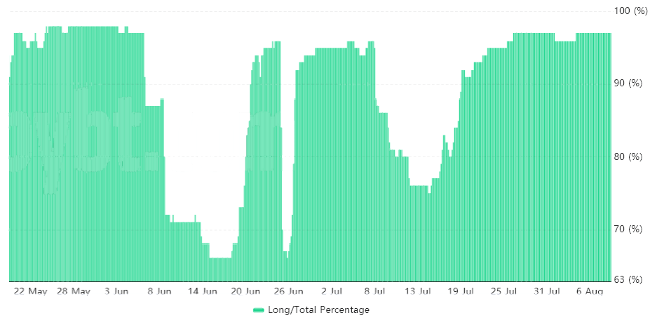 上图显示,在 7 月 9 日至 7 月 19 日的短暂时期后,Bitfinex 的保证金多头回升至 90% 或更高。 然而,此后该比率未见下滑,表明空头缺乏信心。