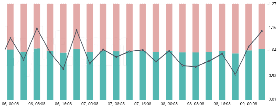 Bybt 整合了来自币安、OKEx 和火币顶级交易商的期货市场数据。 目前的 1.14 指标有利于这些交易所最大用户中 14% 的多头。 因此,过去 12 小时发生了重大变化,因为这些交易者之前是净空头。