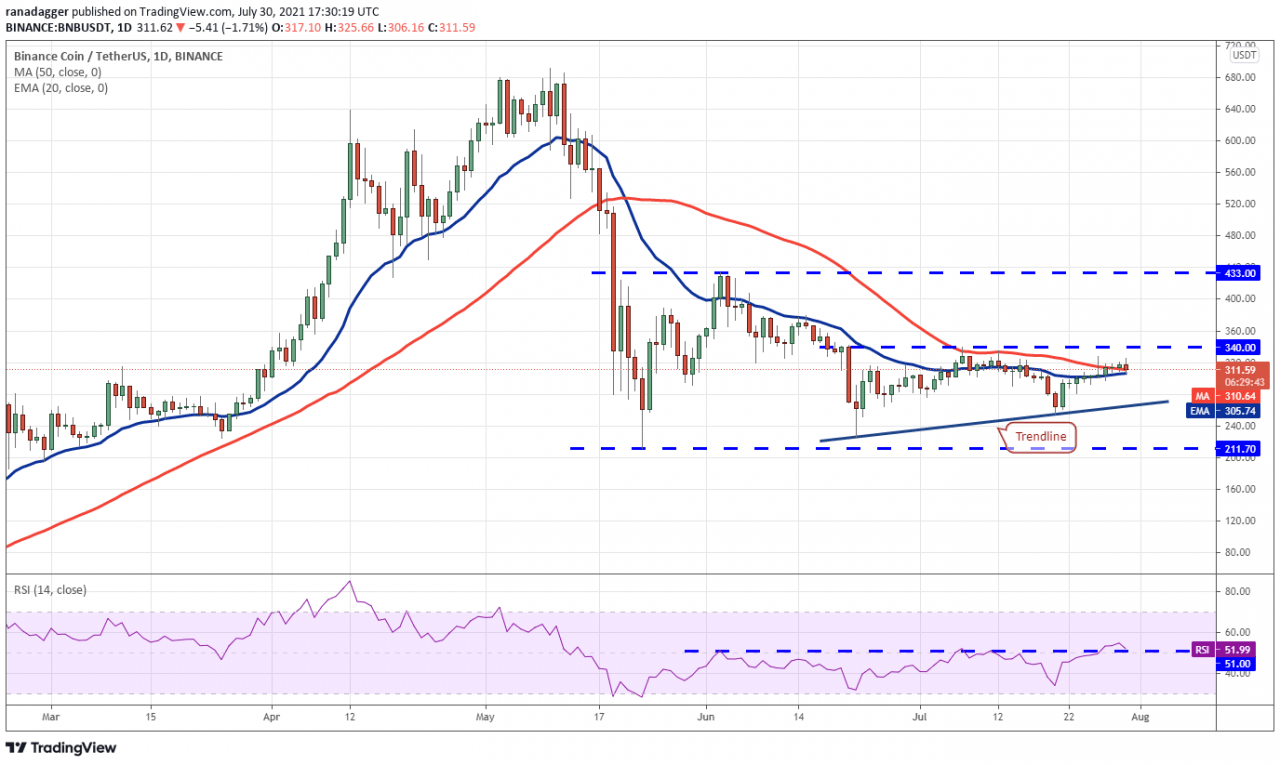 多头在 7 月 29 日将币安币(BNB)推至 50 天简单移动平均线(310 美元)上方,但他们无法挑战 340 美元的上方阻力。 这表明购买在更高的水平上枯竭。
