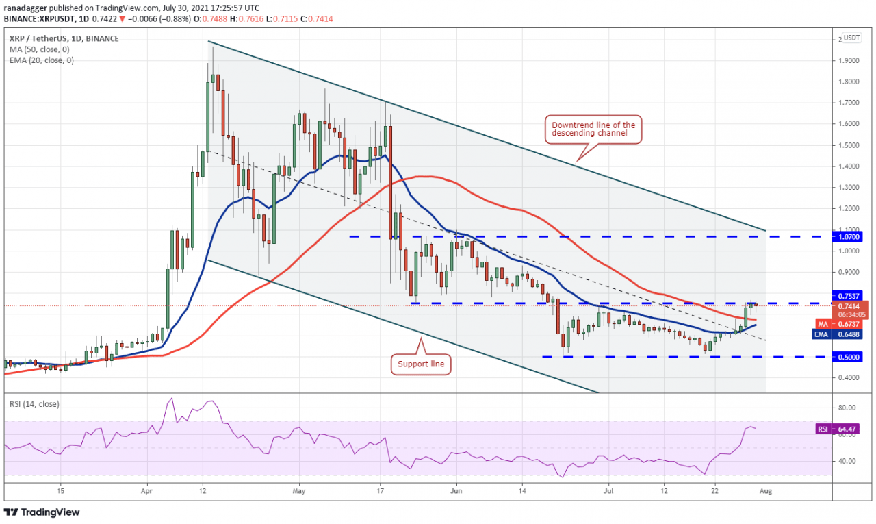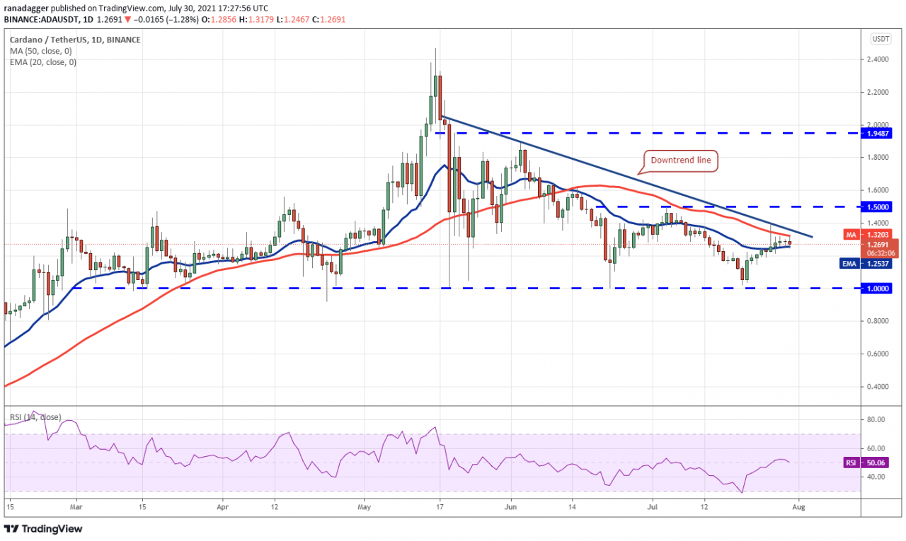 另一方面,如果价格从 20 日均线反弹,多头将再次尝试将价格推高至下跌趋势线上方。 如果发生这种情况,DOT/USDT 货币对可能升至 1.50 美元,空头可能会再次形成强劲阻力。