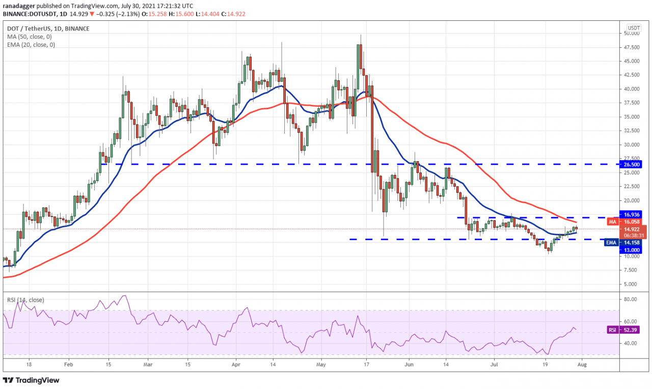 多头在 7 月 27 日将 Polkadot(DOT)推高至 20 日均线(14.15 美元)上方,但他们未能清除 50 日均线(16.05 美元)的障碍。 这表明需求在更高水平上枯竭。