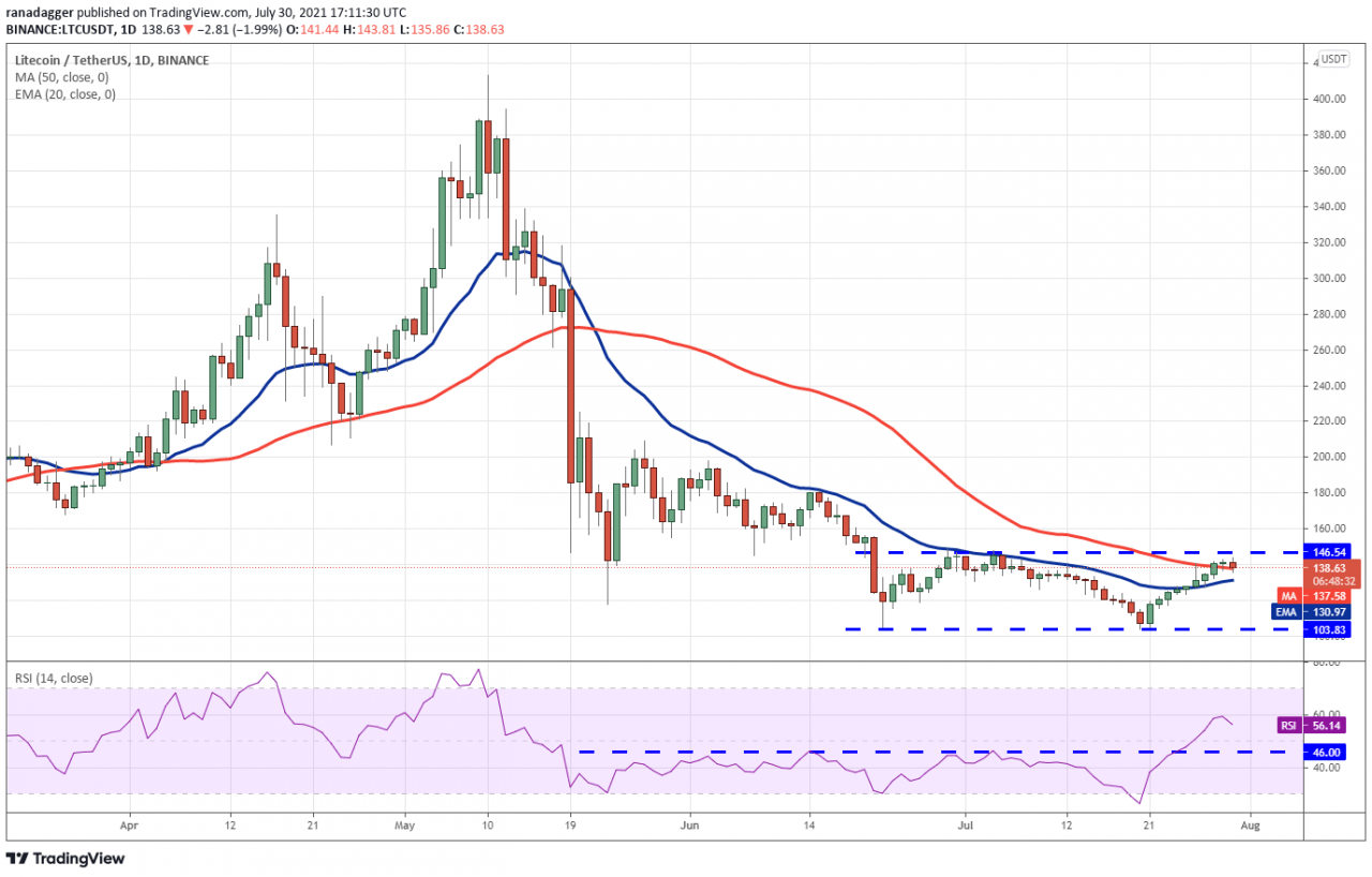 尽管多头在 7 月 28 日将莱特币(LTC)推高至 50 日均线(137 美元)上方,但他们无法清除上方阻力位 146.54 美元的障碍。 这表明空头还没有放弃。