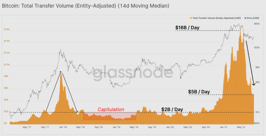 比特币实体调整后的总转账量。 来源:Glassnode