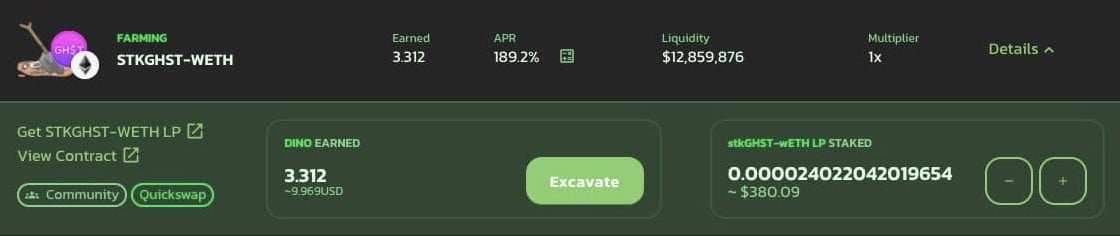DinoSwap 上 STKGHST-WETH LP 存款的奖励。 来源:DinoSwap