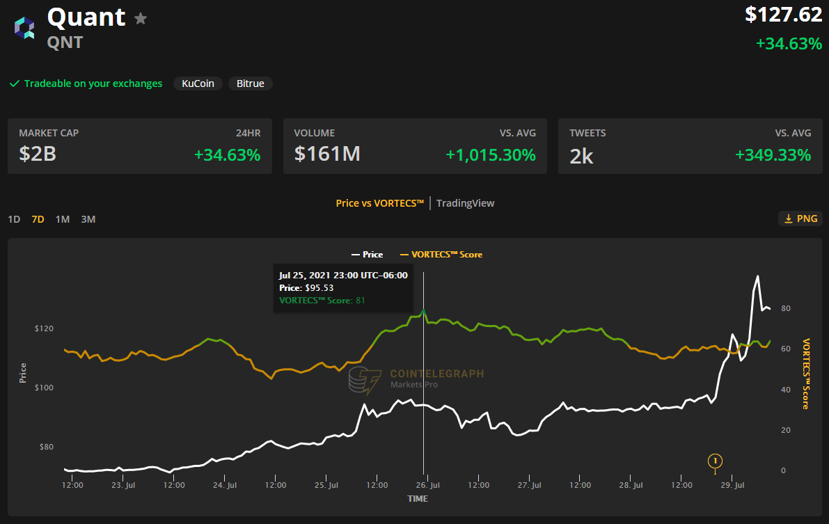 如上图所示,QNT 的 VORTECS™ 得分于 7 月 25 日开始回升,并在接下来两天价格上涨 75% 前大约 24 小时达到了 81 的高位。