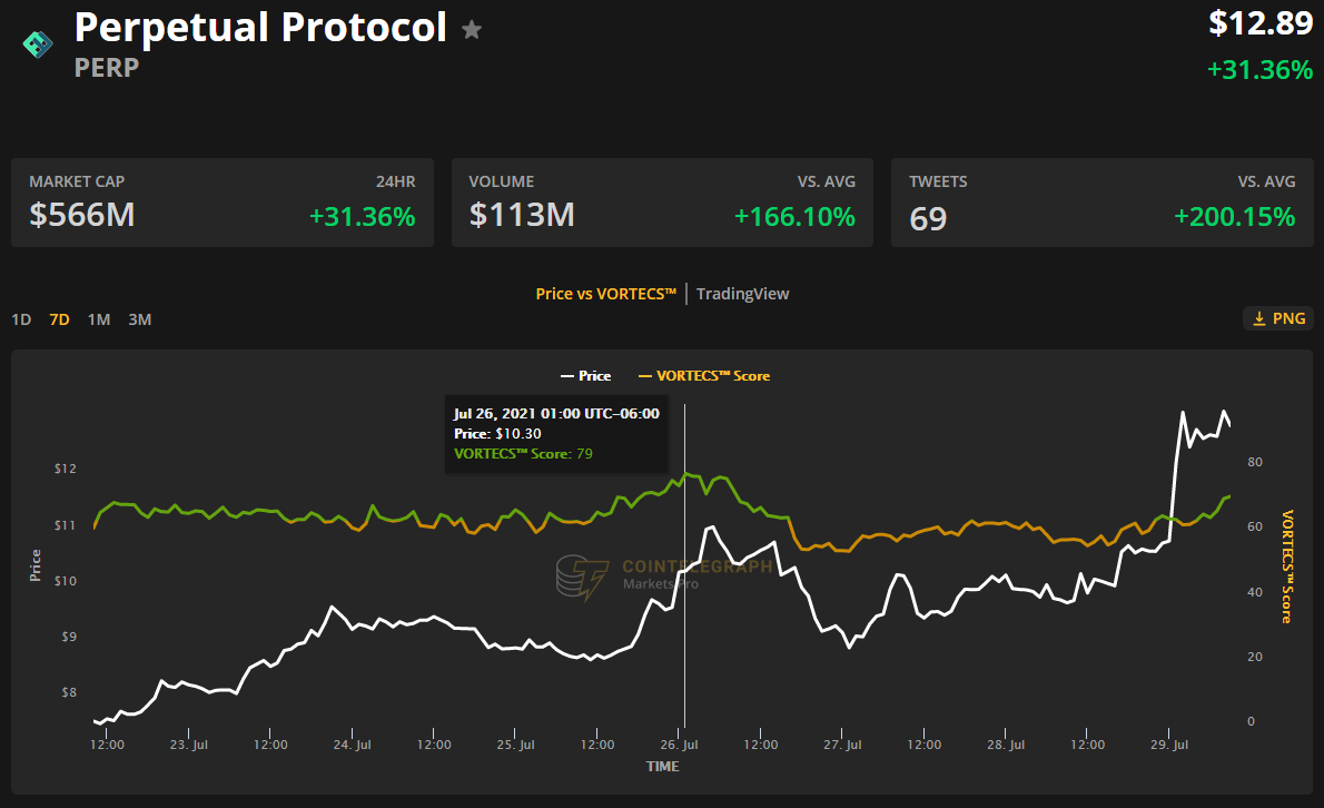 来自 Cointelegraph Markets Pro 的 VORTECS™ 数据于 7 月 25 日开始检测到 PERP 的看涨前景,在最近的价格上涨之前。