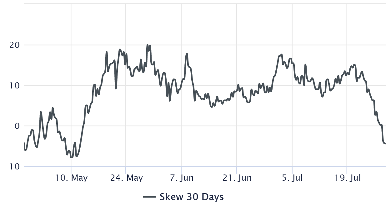 当数字在负 10% 和正 10% 之间振荡时,该指标被视为中性。 5 月 14 日至 7 月 24 日期间,25% 的 delta 偏斜指标一直在发出“恐惧”信号。