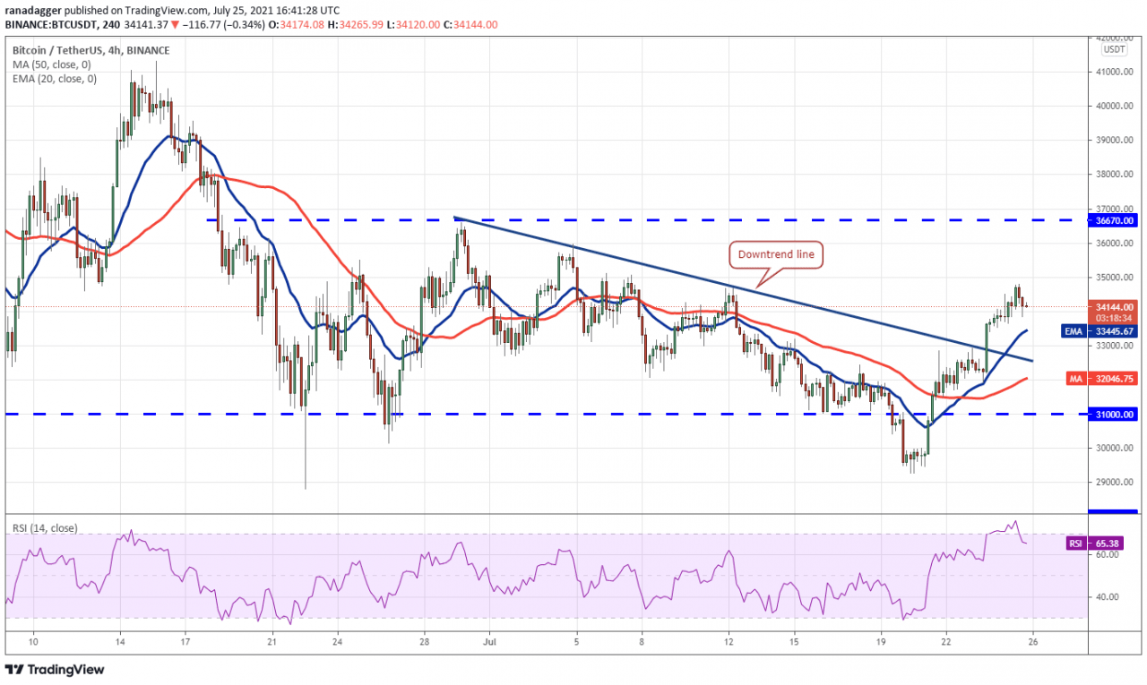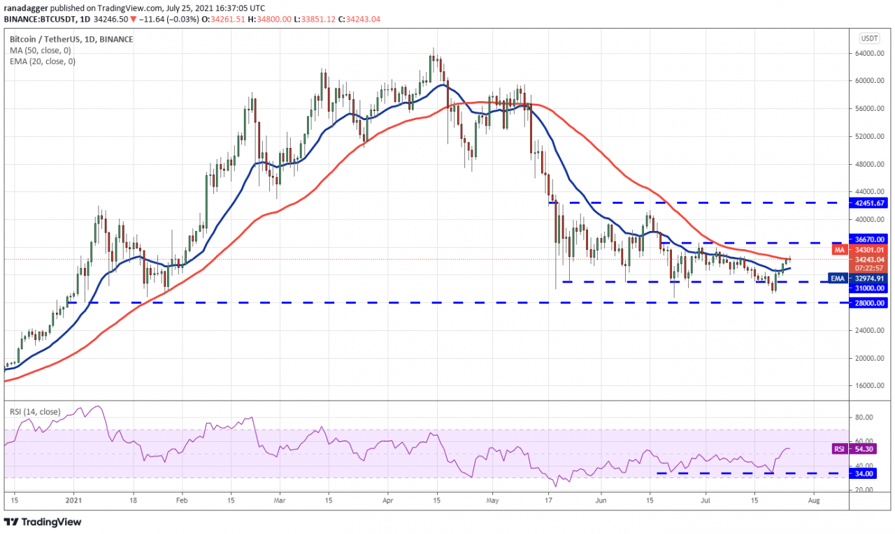 比特币在 7 月 23 日上涨并收于 20 天指数移动平均线(32,974 美元)上方,表明抛售压力正在减轻。 多头目前正试图将价格推高至 50 天简单移动平均线(34,301 美元)上方。
