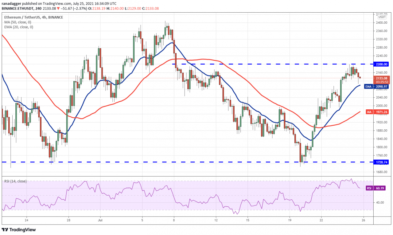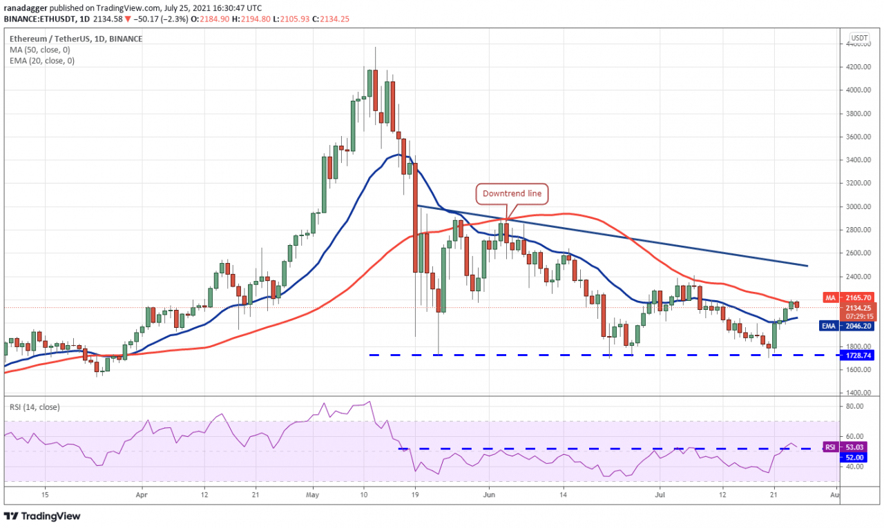 以太币 (ETH) 达到了 50 天均线(2,165 美元),这可能会成为一个强大的障碍,因为空头在 7 月 7 日的这一阻力位阻止了之前的反弹。