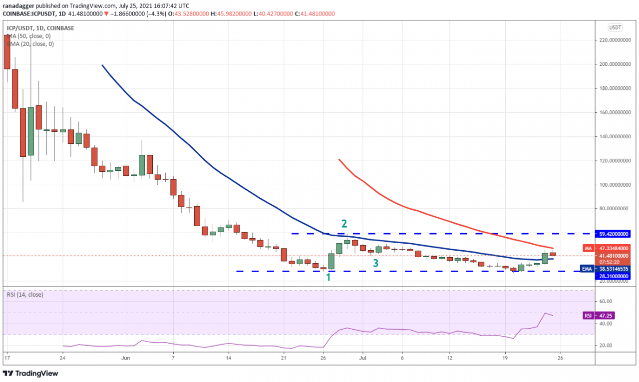 如果多头将价格推高至 50 日均线(47.33 美元)上方,则 ICP/USDT 对可能升至上方阻力位 59.42 美元。 突破并收于该阻力位上方将完成双底形态,表明新的上涨趋势开始。