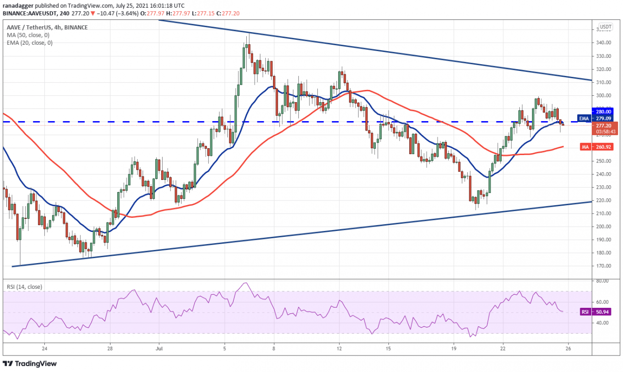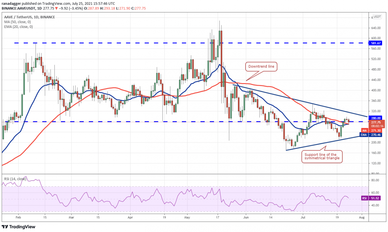 Aave 在 7 月 20 日从 212.54 美元反弹,并在 7 月 23 日升破水平阻力位 280 美元,这表明在较低水平上有强劲买盘。 价格目前停留在对称三角形内。