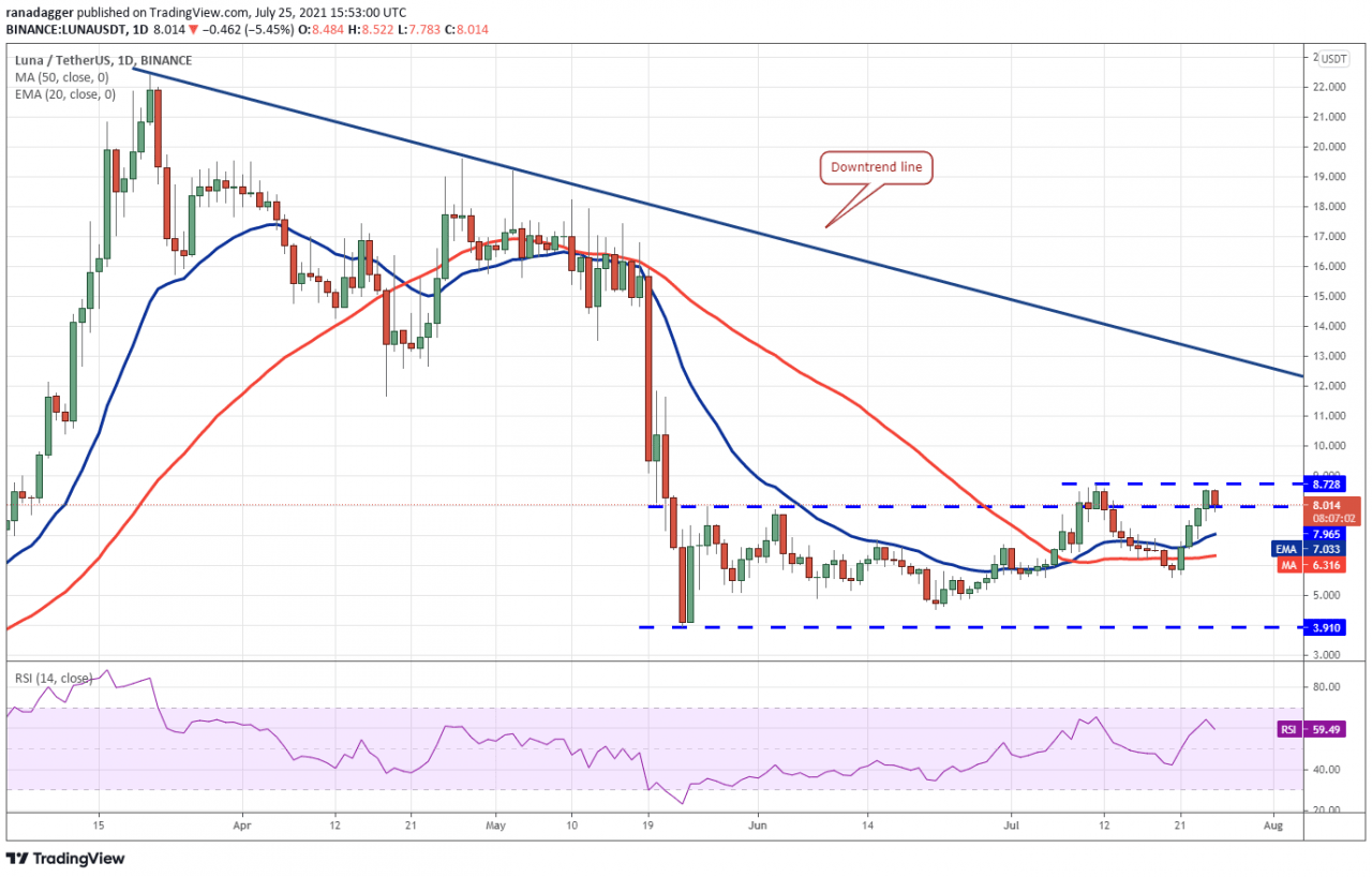 如果多头将价格推高至 8.72 美元上方,则势头可能会回升。 逐渐上涨的 20 天均线(7.03 美元)和 RSI 高于 59 表明阻力最小的路径是上行。 LUNA/USDT 货币对可能会反弹至下跌趋势线。