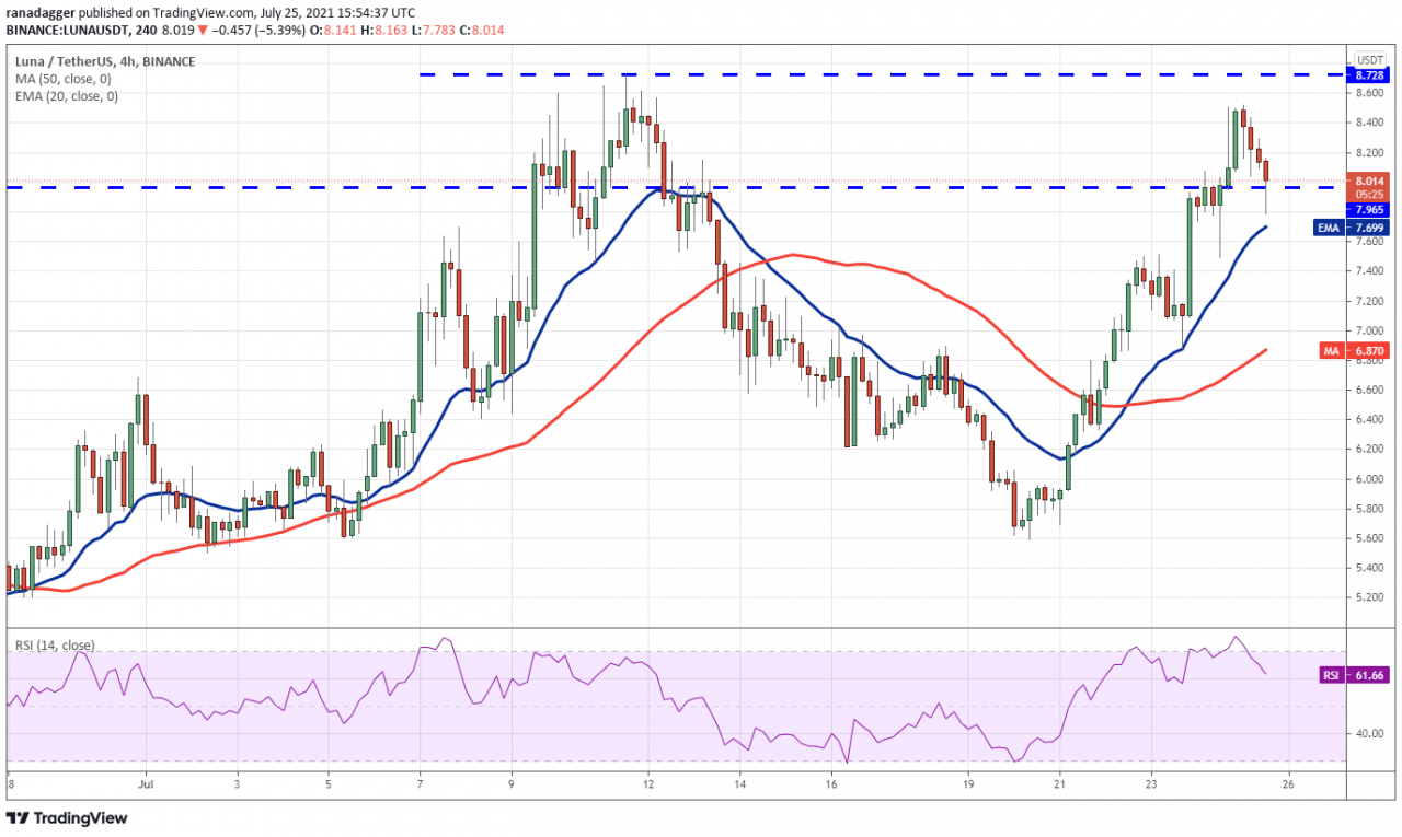 Terra 协议的 LUNA 代币已从 5.58 美元大幅反弹,并达到 7.96 美元至 8.72 美元的上方阻力区。 空头在 7 月 11 日停止了多头在该区域的先前复苏尝试。