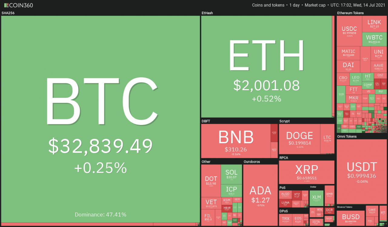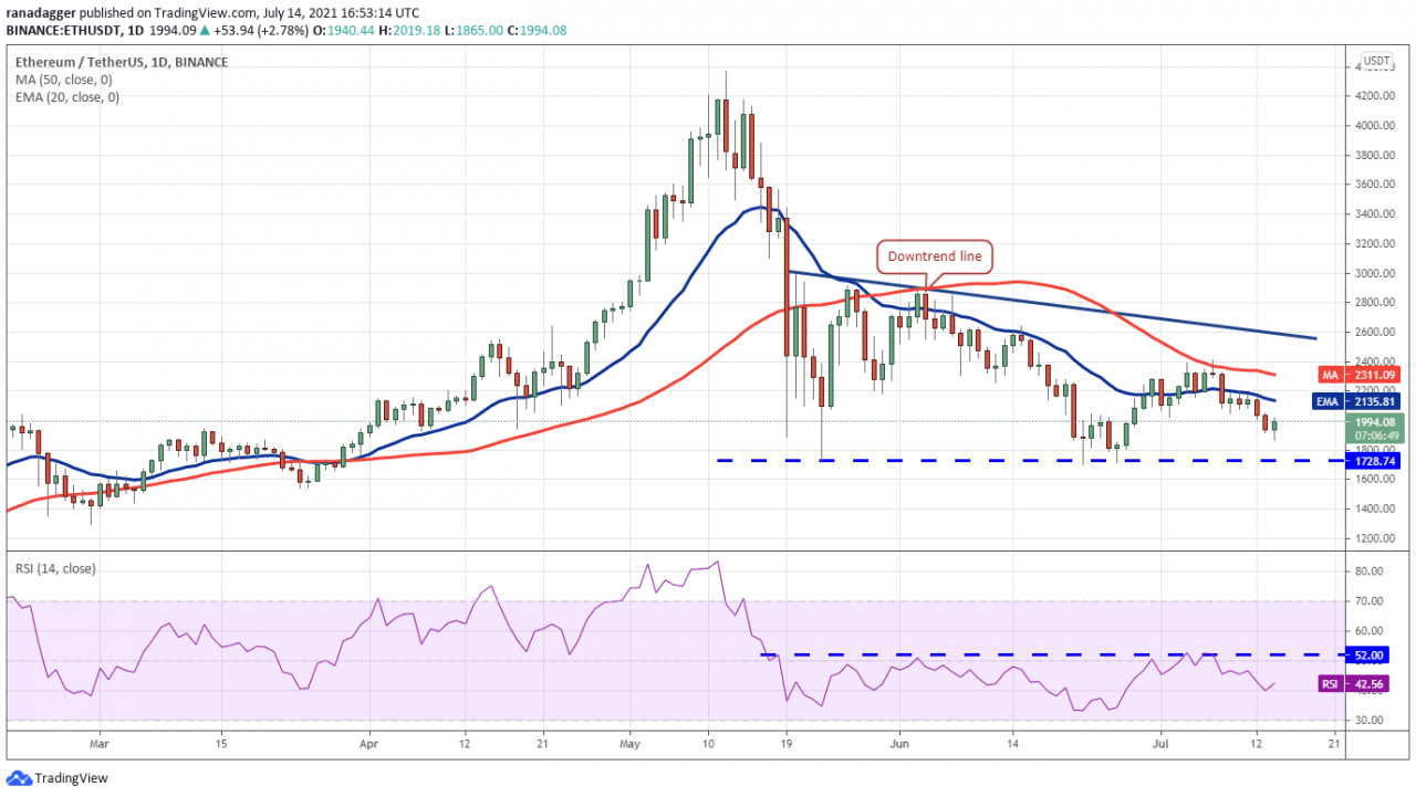 从 7 月 9 日到 12 日,多头未能将(ETH)推高至 20 天均线(2,135 美元)上方,这可能吸引了短期交易者的抛售。 这使价格在 7 月 13 日跌破心理价位 2,000 美元。