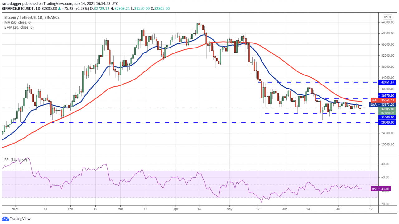 今天比特币烛台的长尾表明多头正在积极捍卫 31,000 美元的水平。 然而,买家将在 20 天指数移动平均线(33,973 美元)处面临空头的强烈阻力。