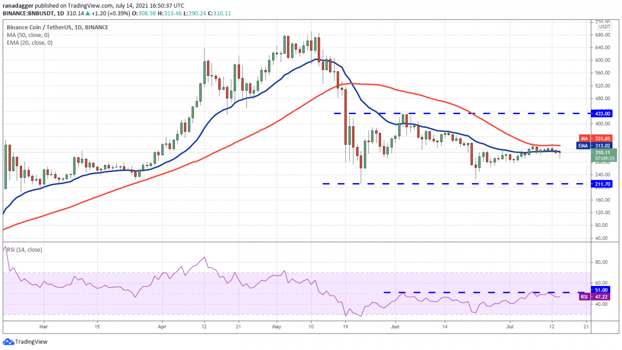 币安币(BNB)在 7 月 13 日跌破 20 天均线(313 美元),表明空头正试图占上风。 然而,今天烛台上的长尾表明多头不愿放弃并逢低买入。