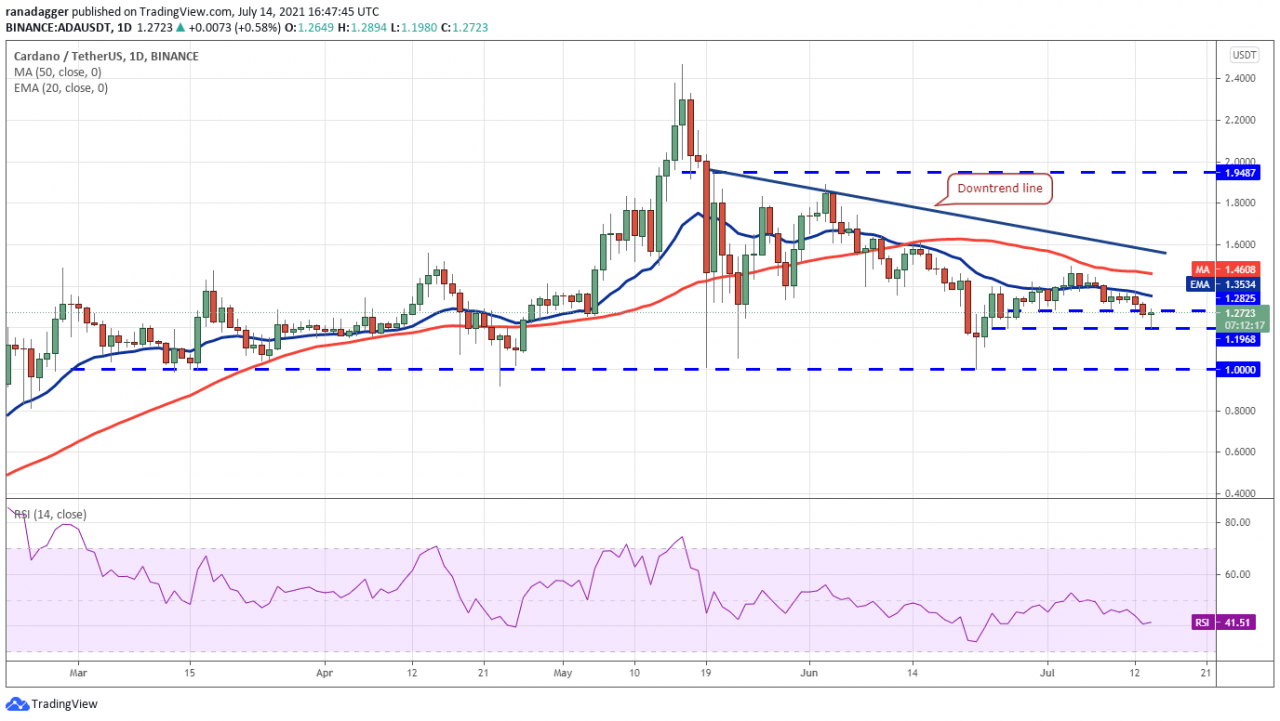 从 7 月 9 日到 12 日,多头未能将卡尔达诺(ADA)推高至 20 天均线(1.35 美元)上方,这可能导致短期交易者获利了结。 这将价格拉低至 7 月 13 日的 1.28 美元支撑位下方。