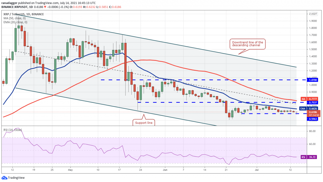 XRP 已逐渐下跌至 0.59 美元的水平支撑位。 这对多头来说是一个重要的水平,因为如果他们未能捍卫它,空头将攻击 6 月 22 日的低点 0.50 美元。