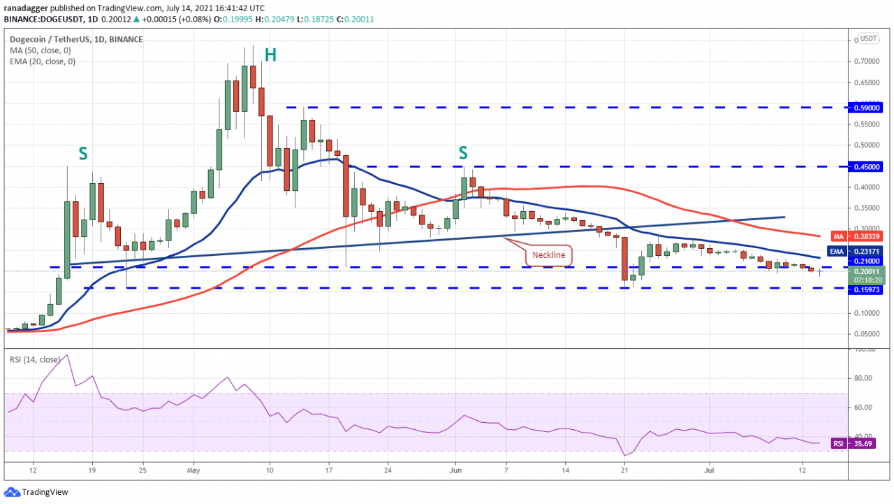狗狗币(DOGE)在 7 月 12 日突破并收于 0.21 美元的支撑位下方,这表明供过于求。 多头未能捍卫 0.21 美元为重新测试关键水平 0.15 美元扫清了道路。