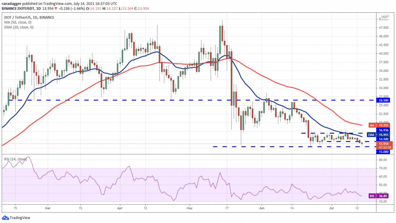 Polkadot (DOT) 在 14.50 美元和 16.93 美元之间的紧密盘整以 7 月 13 日的崩盘告终,这表明供过于求。 这将价格拉低至关键支撑位 13 美元。