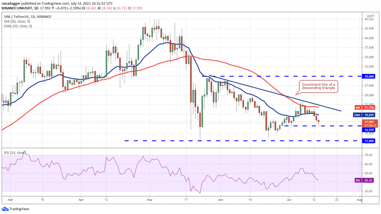 Uniswap(UNI)在 7 月 12 日跌破 20 天均线(19.81 美元),这表明空头已经压倒了多头。 16.93 美元有一个小支撑,但如果该水平让步,山寨币可能会跌至 15 美元,然后跌至 13 美元。