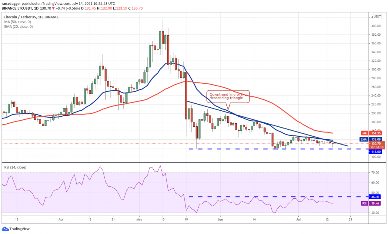 莱特币 (LTC) 在下跌三角形模式内交易,该模式将在细分时完成并收于 118 美元以下。 今天烛台上的长尾表明多头正试图捍卫支撑位。
