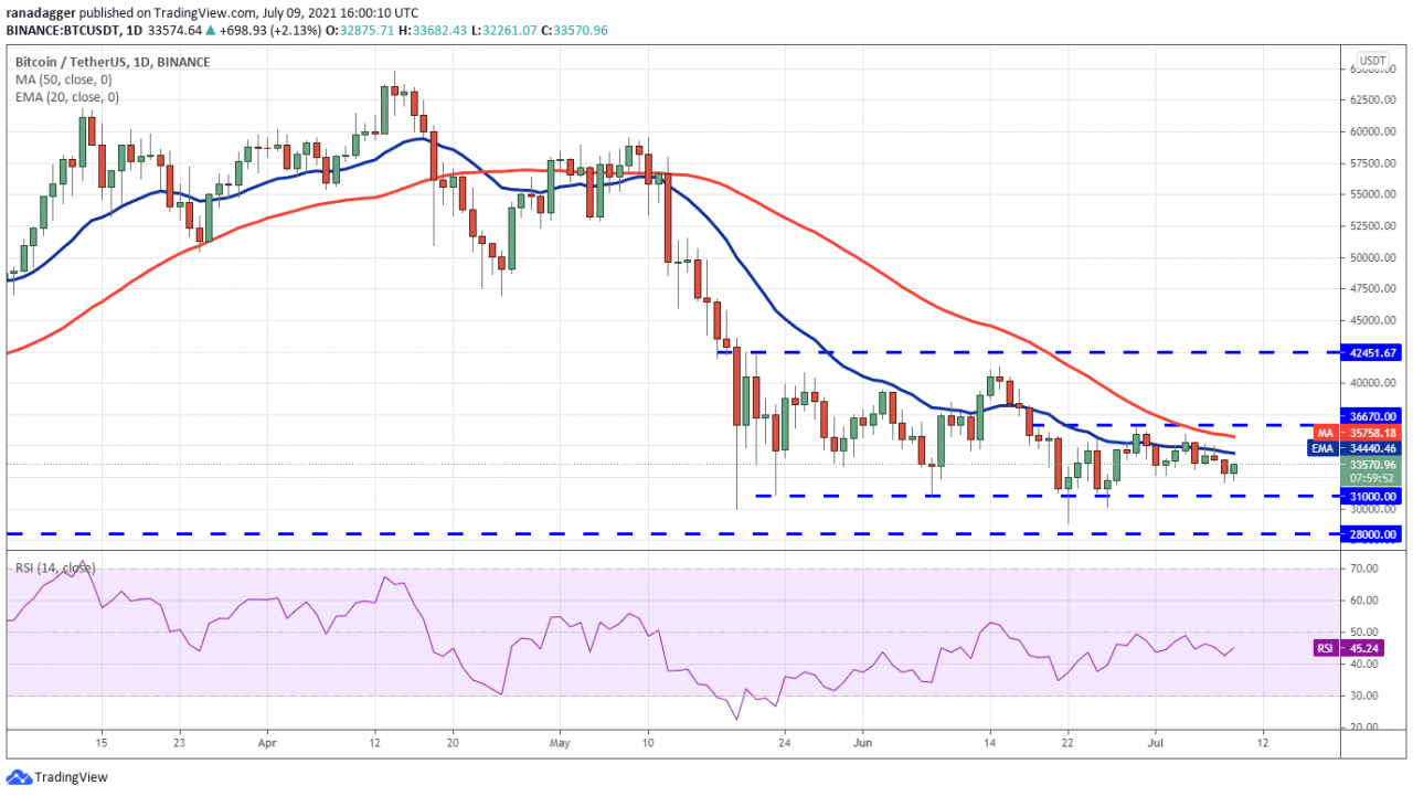 卖家现在将尝试将 BTC/USDT 对压低至 31,000 美元至 28,000 美元的支撑区域下方。 然而,这不太容易,因为多头将在该区域进行强有力的防御。