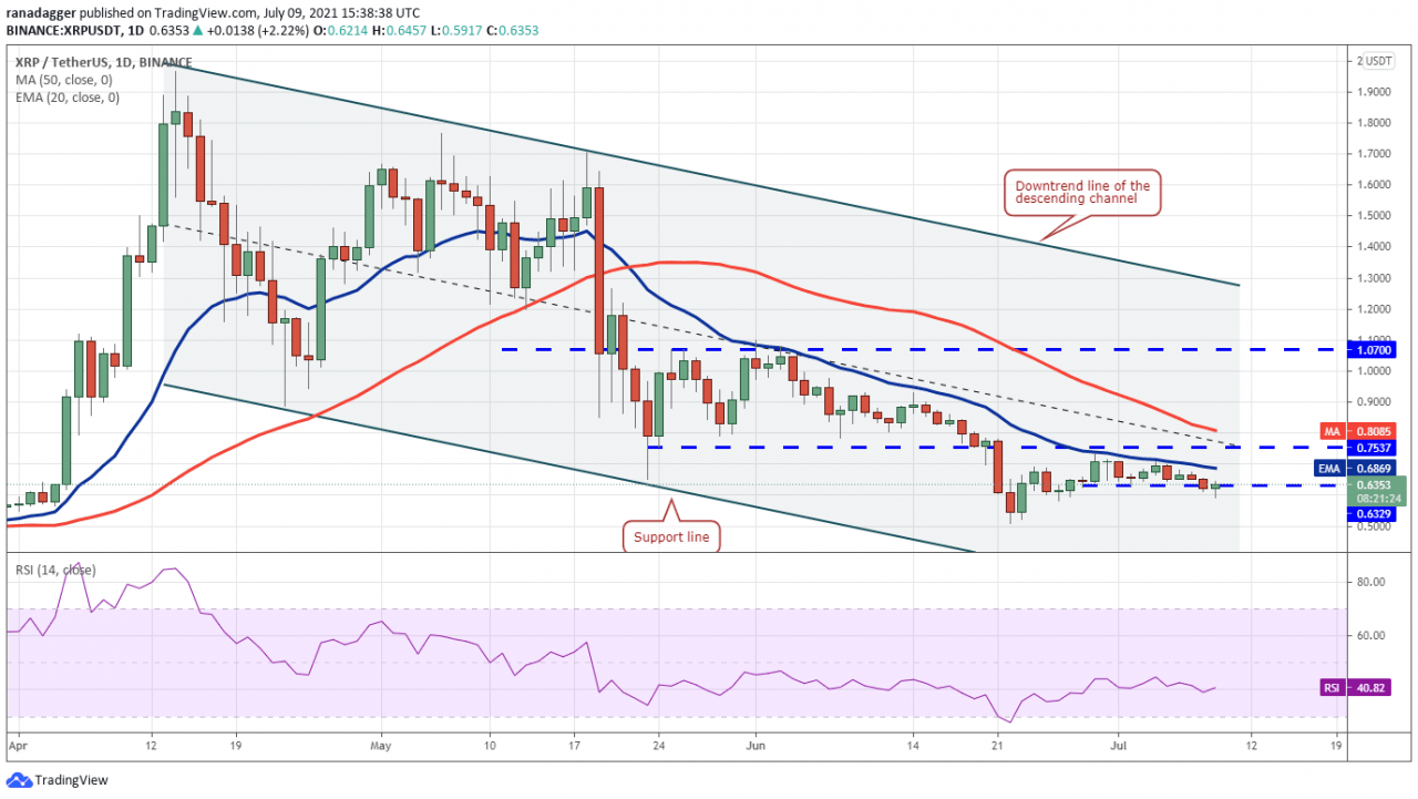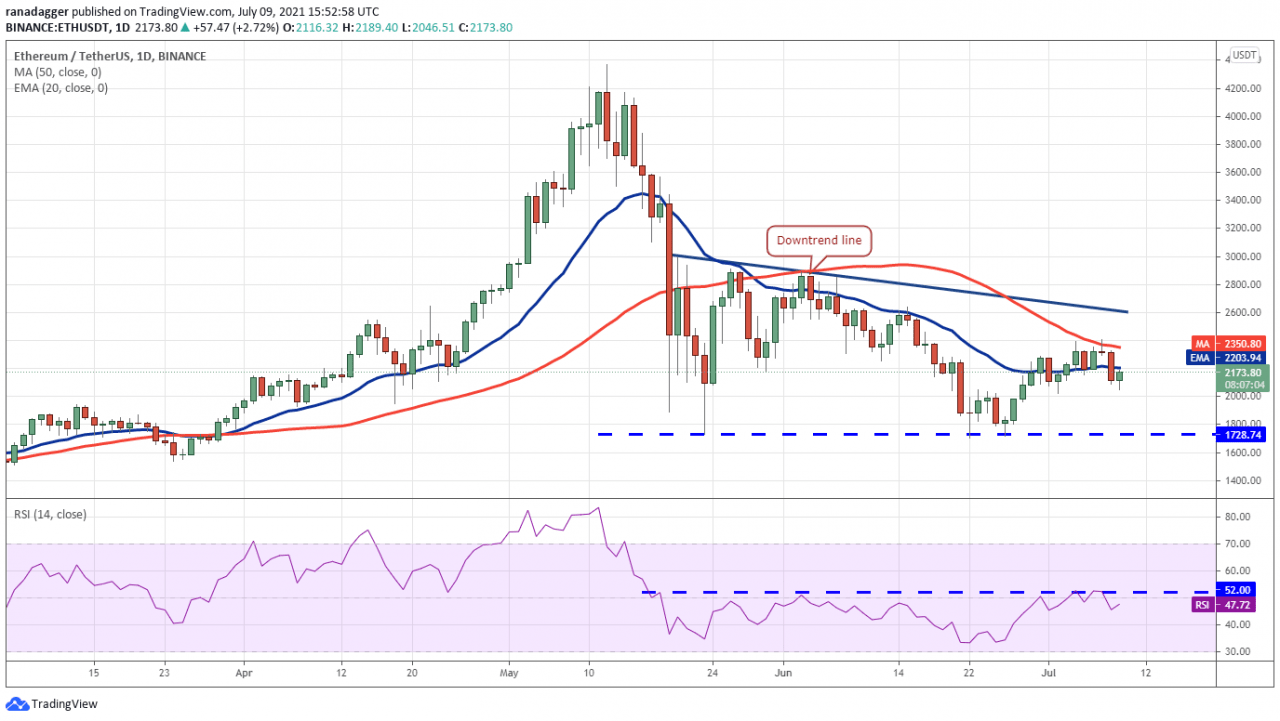 ETH/USDT 对在 7 月 8 日跌破 20 日均线(2,203 美元),但积极的迹象是多头正在积极捍卫 2,000 美元的支撑位。 如果买家将价格推高至移动平均线上方,则该货币对可能升至下跌趋势线。 突破该水平将是修正可能即将结束的第一个迹象。