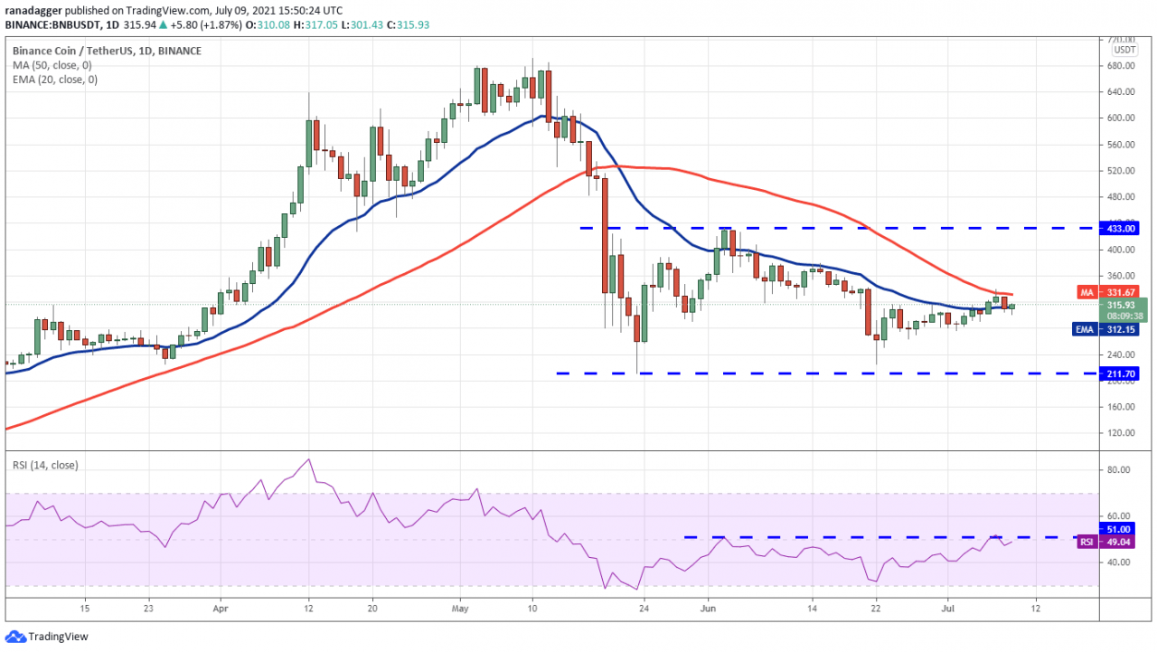 币安币(BNB)的救济反弹在 50 日均线(231 美元)处碰壁,这表明空头继续在更高的水平卖出。 卖家现在将尝试将价格拉低至 20 天均线(312 美元)以下。