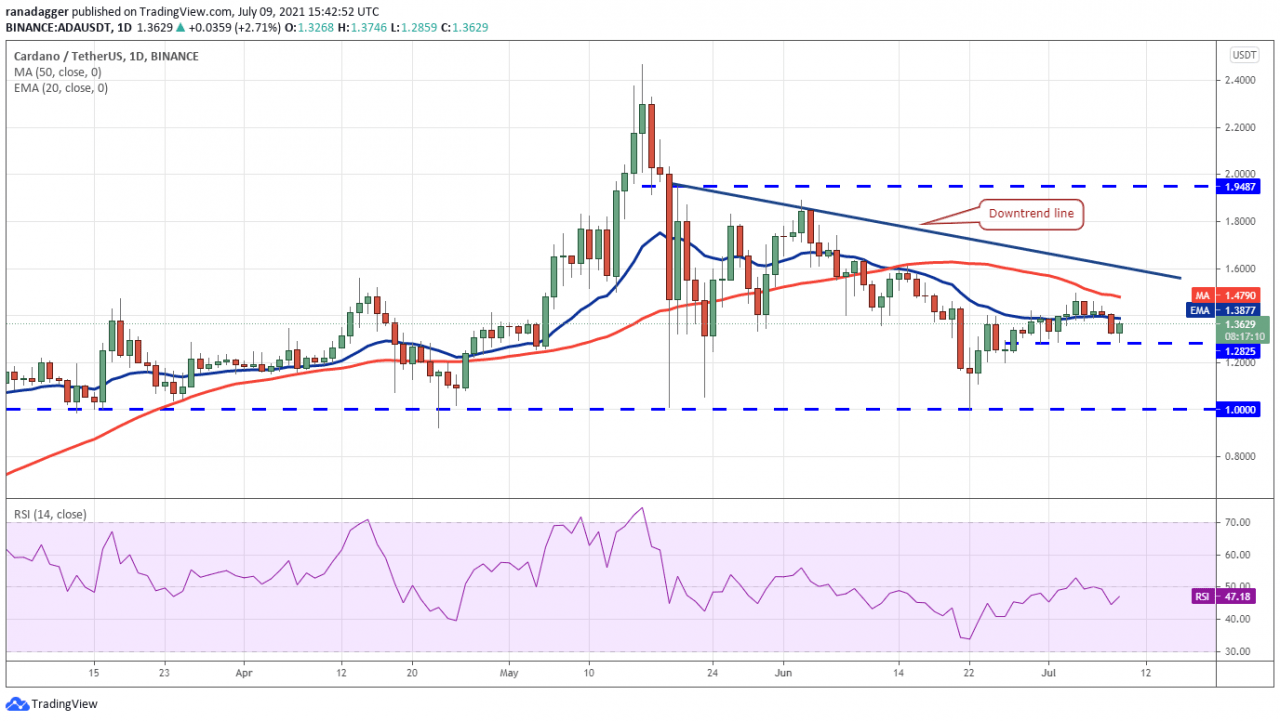 价格从今天的 1.28 美元支撑位反弹。 多头现在将尝试将 ADA/USDT 对推高至 20 天均线上方。 如果他们成功,买家将再次尝试清除 50 日均线(1.47 美元)的障碍并将该货币对推至下跌趋势线。