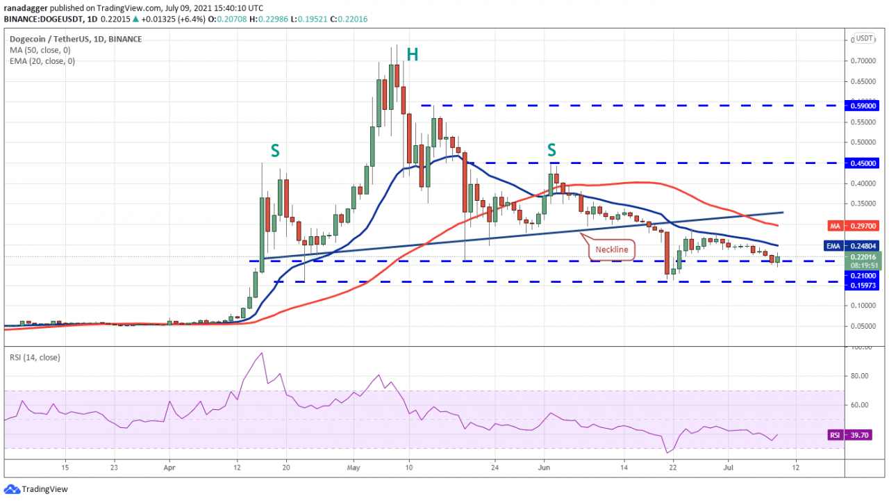 狗狗币(DOGE)在 7 月 8 日跌破 0.21 美元的支撑位。然而,积极的迹象是多头并没有在突破时抛售头寸,而是逢低买入。 这表明在较低水平上增持。