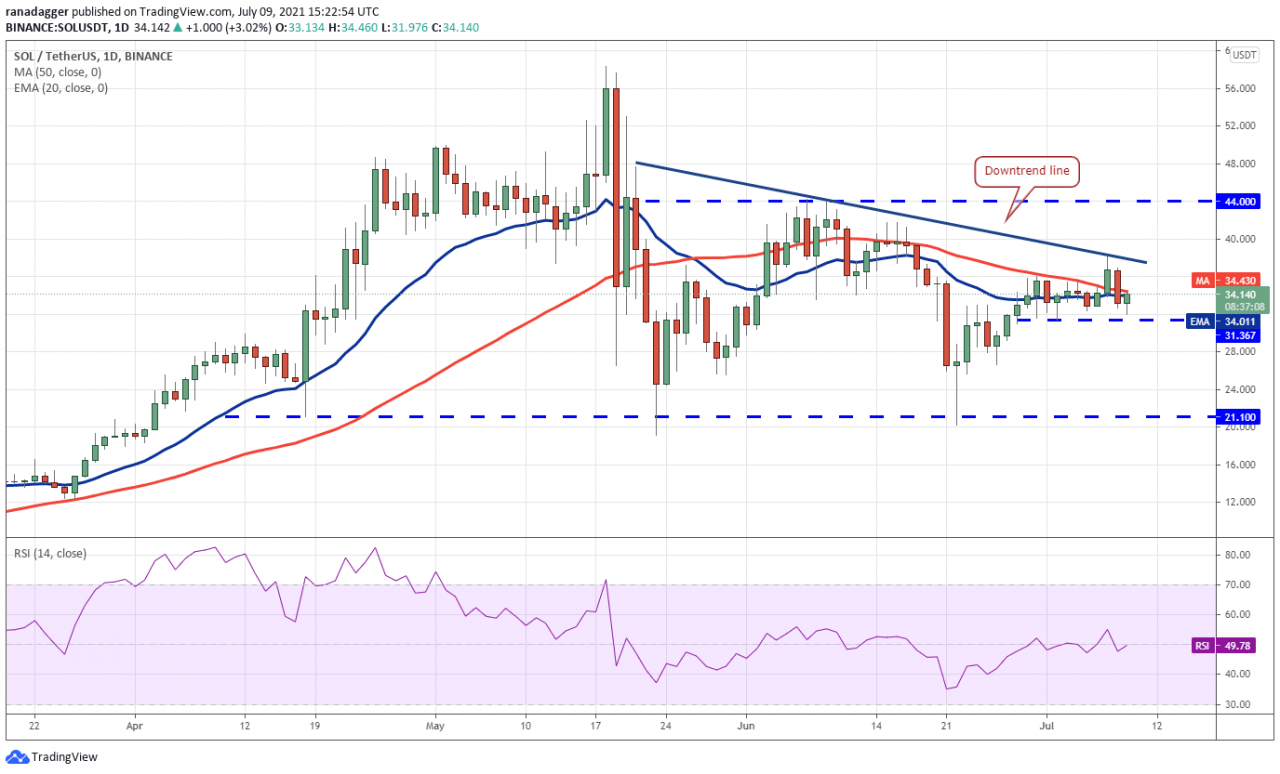 Solana (SOL) 在 7 月 7 日突破了 50 日均线(34.43 美元),但多头无法清除下跌趋势线的障碍。 空头在该阻力位卖出,并在 7 月 8 日将价格拉回移动平均线以下。