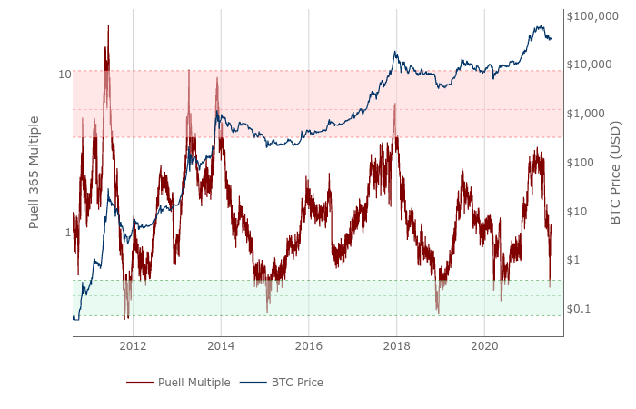 比特币 Puell 倍数与 BTC/USD K线走势图。 资料来源:LookIntoBitcoin.com