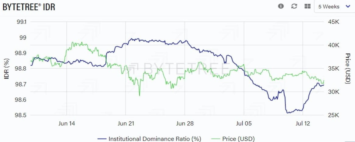 监控比特币热图前五分之一的机构支配率也显示从 7 月 12 日开始增加。 这表明大型比特币持有者在过去几天增加了他们的活动,而比特币的价格持有超过 31,000 美元。