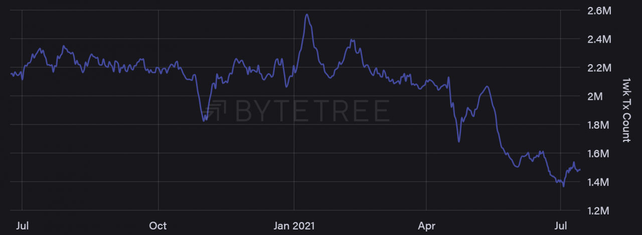 根据 Bennett 的说法,自 4 月以来,每周比特币交易一直处于急剧下滑状态,现在接近 148 万笔交易,低于 1 月 9 日的 257 万笔交易。