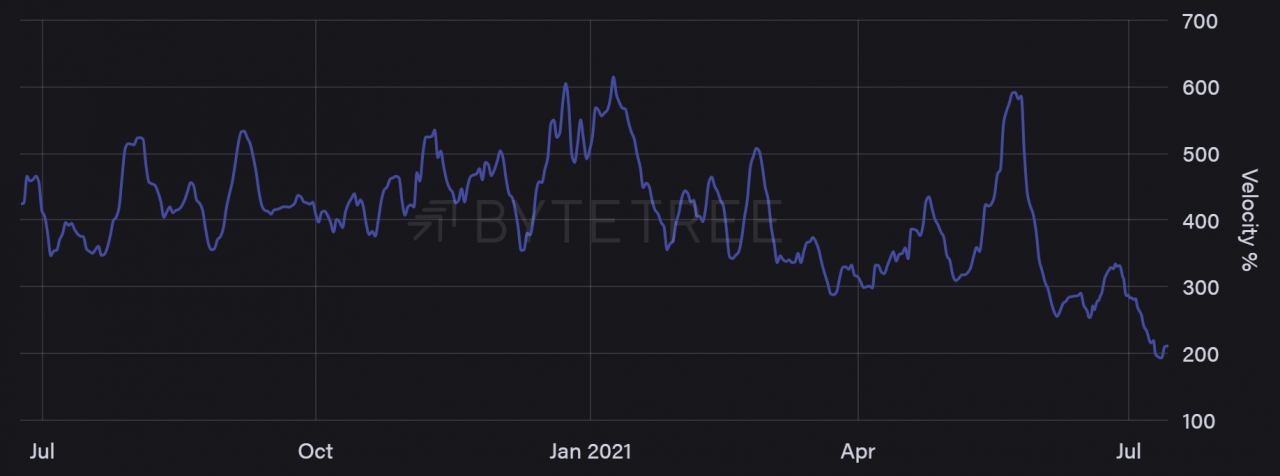 比特币流通速度在 7 月 11 日创下 195% 的历史新低,较 5 月 23 日的近期高点 593% 大幅下跌。 Bennett 表示,流通速度是“一个非价格指标,衡量比特币网络的活力” .